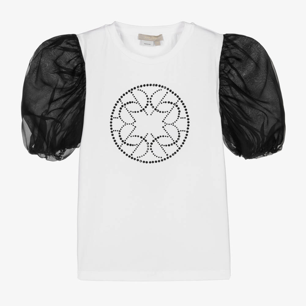 An elegant top for teen girls by renowned couture designer, Elie Saab. Creating a monochrome silhouette, the main body is made in white soft cotton jersey and is accented with black silk organza puff sleeves. The front of the T-shirt is decorated with sparkly black beads in the shape of the designer's signature geometric logo.