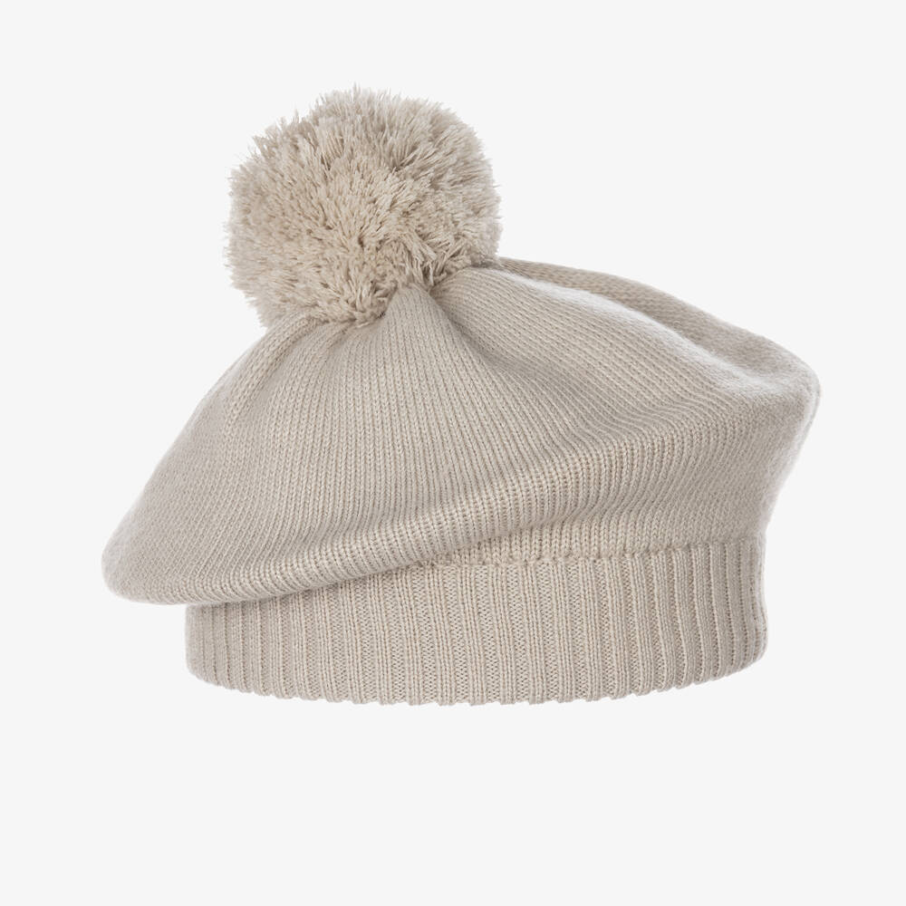 Light beige-grey beret for girls by Elodie, knitted in a soft wool blend. Ideal for cold winter days, this timeless hat has a lovely pom-pom on the top and a faux leather logo tab on the trim for a subtle branded touch.