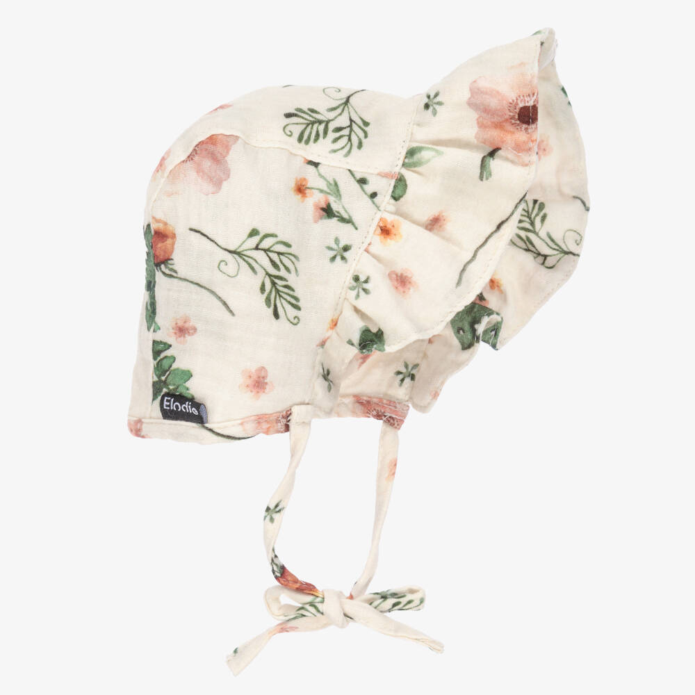 Gorgeous ivory floral bonnet for baby girls, by Elodie. Made in soft cotton muslin, it has a sweet ruffle on the front, and easily ties underneath the chin.