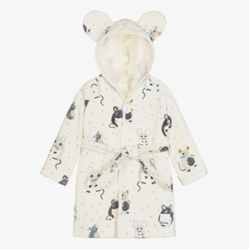 Ivory bathrobe for little boys and girls by Swedish brand Elodie, patterned with grey mice. It is made in soft cotton velour with an absorbent towelling inside and has a hood with appliqué mouse ears. It fastens with large ivory buttons on the front and has a detachable sash. There is a logo tab by the hemline.