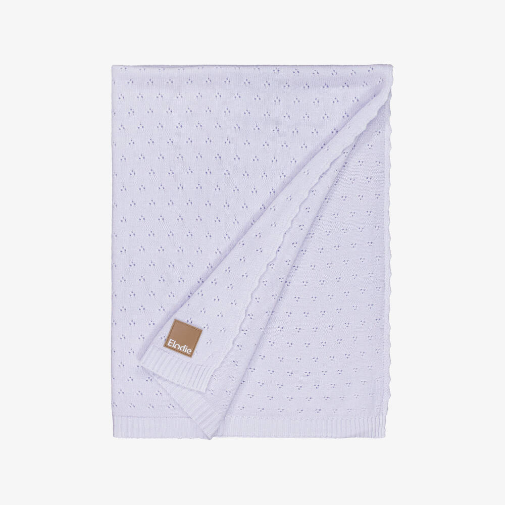 Lovely pale blue blanket for baby girls by Swedish brand Elodie, with a lacy, pointelle knit. Super soft and comfortable, it is ideal for the nursery, for use in the stroller or car seat or for presenting baby. There is a brown, faux leather logo badge in one corner.
