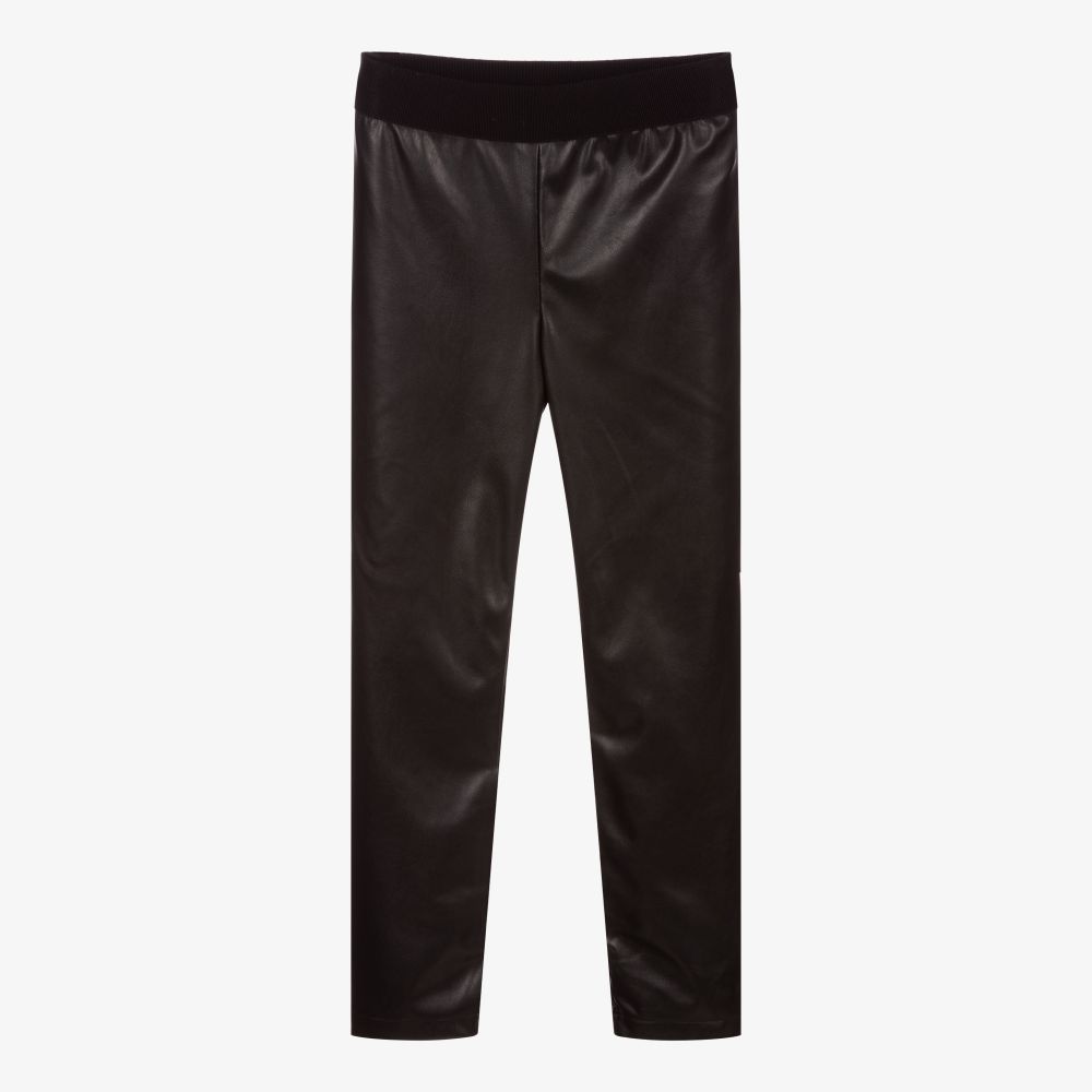 Girls black leggings from Italian designer Elsy, made in soft faux leather with a soft felt-like feel inside. They are full-length and have a comfortable elasticated waistband.