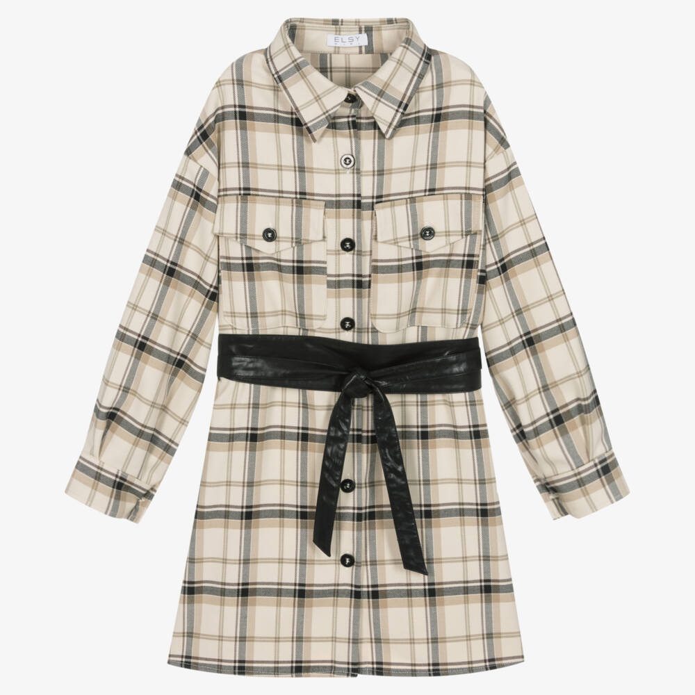 Casually styled, beige and black check dress for girls by Elsy, made in a beautifully soft viscose blend. Designed with classic shirt styling, it has a pointed collar, with button-fastening chest pockets and cuffs. It fastens neatly on the front with black buttons and for a stylish finish, comes with a removable faux leather tie belt.