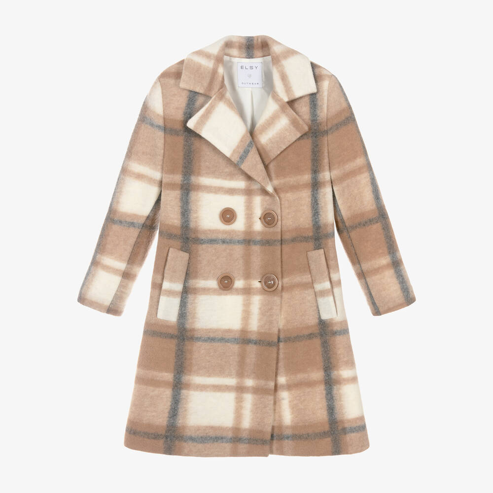 In a lovely beige and grey check, this stylish coat for girls is by Italian brand Elsy. It is made in a beautifully soft wool blend with a cosy felted feel. Lined in silky satin, it has a classic double-breasted button fastening, with useful front pockets to finish.