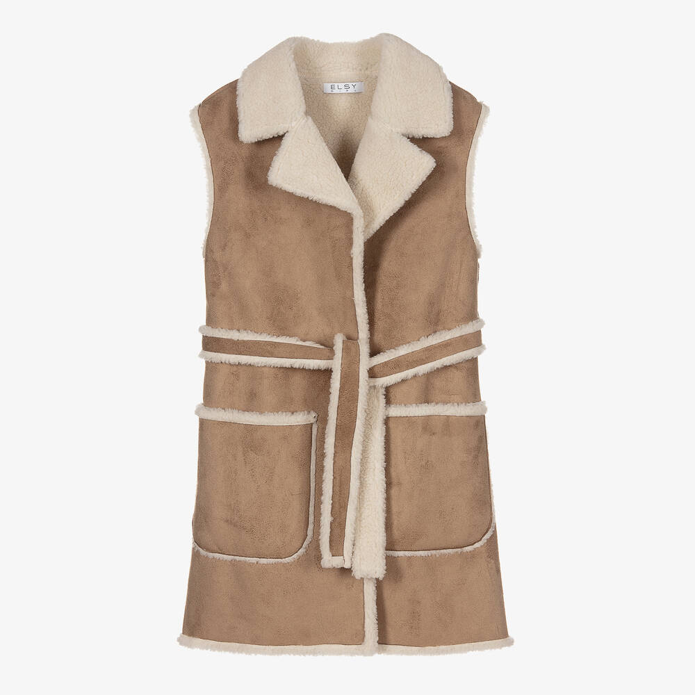 Stylish faux suede beige long gilet for girls by Italian brand Elsy. It is lined with faux shearling for added comfort and has a detachable tie belt around the waist for a better fit. The drop pockets on the front are also lined and trimmed with faux shearling.