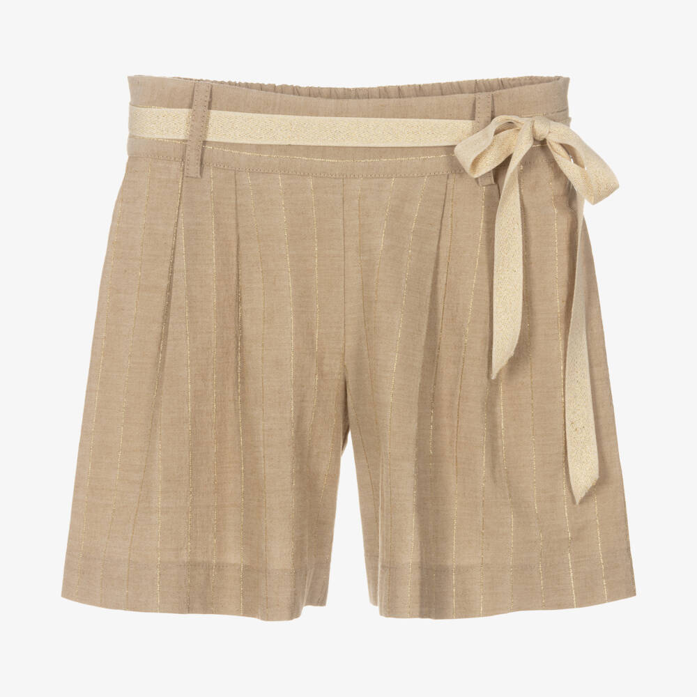 Stylish beige shorts for girls by Elsy, woven in a soft cotton and viscose blend. Embroidered with shimmery gold stripes, they have smart pleated trims and an ivory sash belt. The waist is part elasticated for comfort and style.