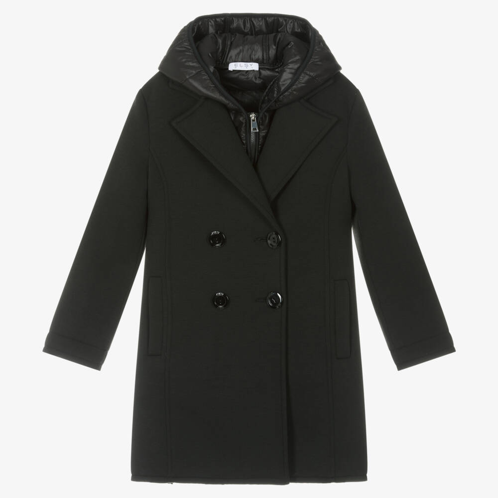 A smart black coat for girls by Elsy, made in a soft viscose jersey blend. With a hint of stretch, it has a lapel collar and front button fastenings for a double-breasted silhouette. It is comfortably lined in grey marl jersey and completed with two front pockets for small essentials. For two looks in one, it comes with a detachable, hooded gilet with lightweight padding for an extra layer of warmth. Worn alone or with the coat, this silky soft piece has a front zip fastening, lightly elasticated trims and handy front pockets.