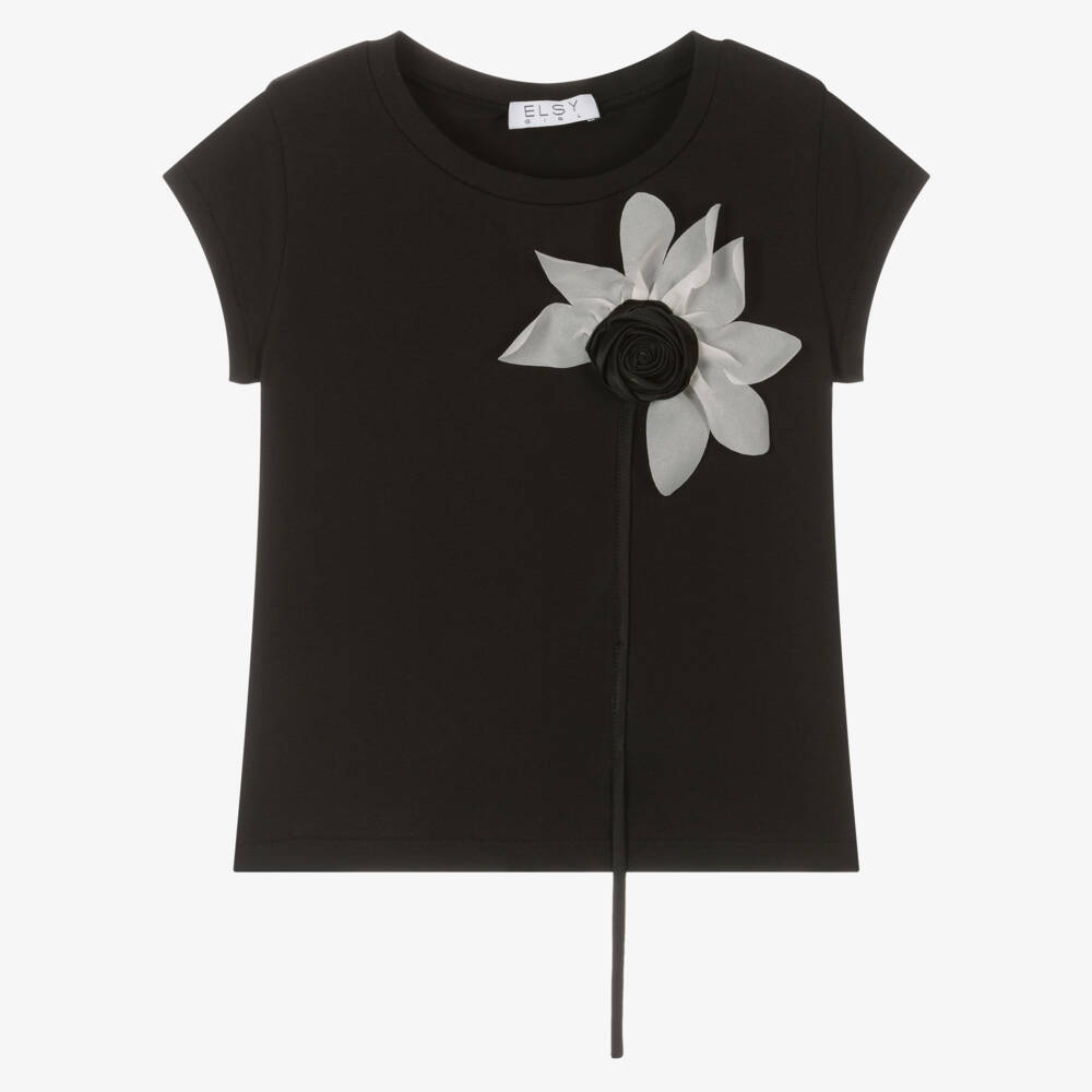 Stylish black cotton T-shirt for older girls by Elsy, combining elegance with the comfort of jersey. With capped sleeves, it features a beautiful floral appliqué that has ivory georgette petals, with a satin centre and stalk that falls below the hemline.