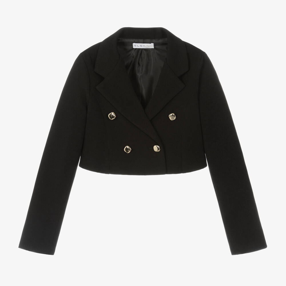 Smart black blazer for older girls by Elsy, made from soft and stretchy crêpe jersey. In a stylish cropped design, this double-breasted jacket has classic notched lapels and shiny gold buttons on the front. A silky lining ensures comfortable wear.