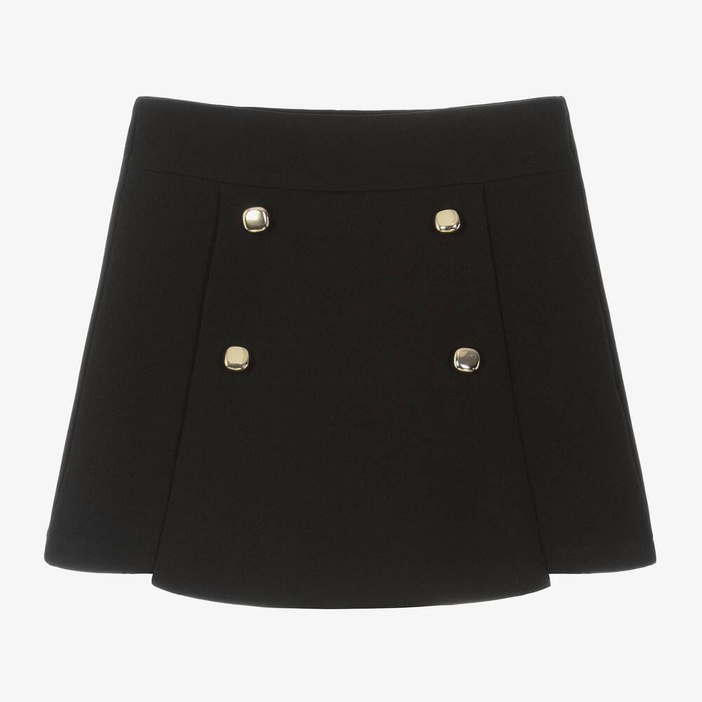 A chic black crêpe jersey skort for older girls by Elsy, ideal for those smarter occasions. Both stylish and comfortable, there is a lined panel on the front decorated with shiny gold buttons and for ultimate comfort, the waistband is gently elasticated.
