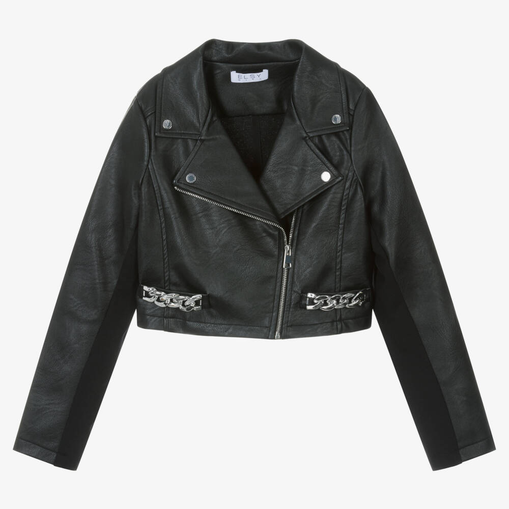 A black biker jacket for girls designed by Elsy. This chic outerwear style is made in beautifully soft faux leather, with expertly panelled viscose jersey on the lower sleeves and back for breathability and a sleek silhouette. Faux front pockets with acrylic silver chain detailing, branded rivets, and an asymmetric front zip add feminine style and beauty to this cool jacket.