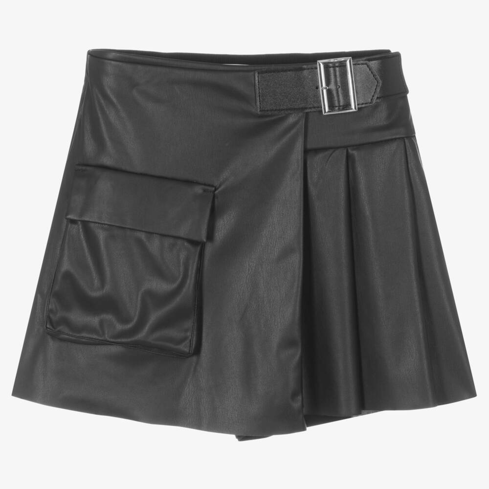 A trendy black leather skort for older girls by Elsy, made from soft faux leather. Super stylish, it has pleats on one side and a cool front flap design with a large patch pocket. It fastens with a discreet side zip and a statement silver buckle to complete the fashion forward look.