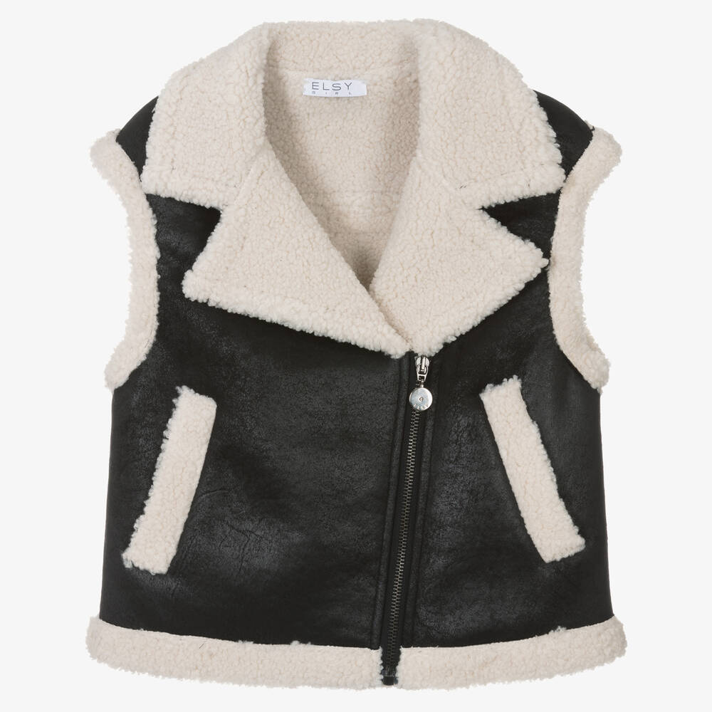 A black and ivory gilet for girls from Elsy. This chic jacket is made in beautifully soft faux suede leather, with a sherpa fleece lining for cosiness. It has side pockets, a fluffy collar and an asymmetric front zip with a logo and diamanté detail for subtle sparkle.