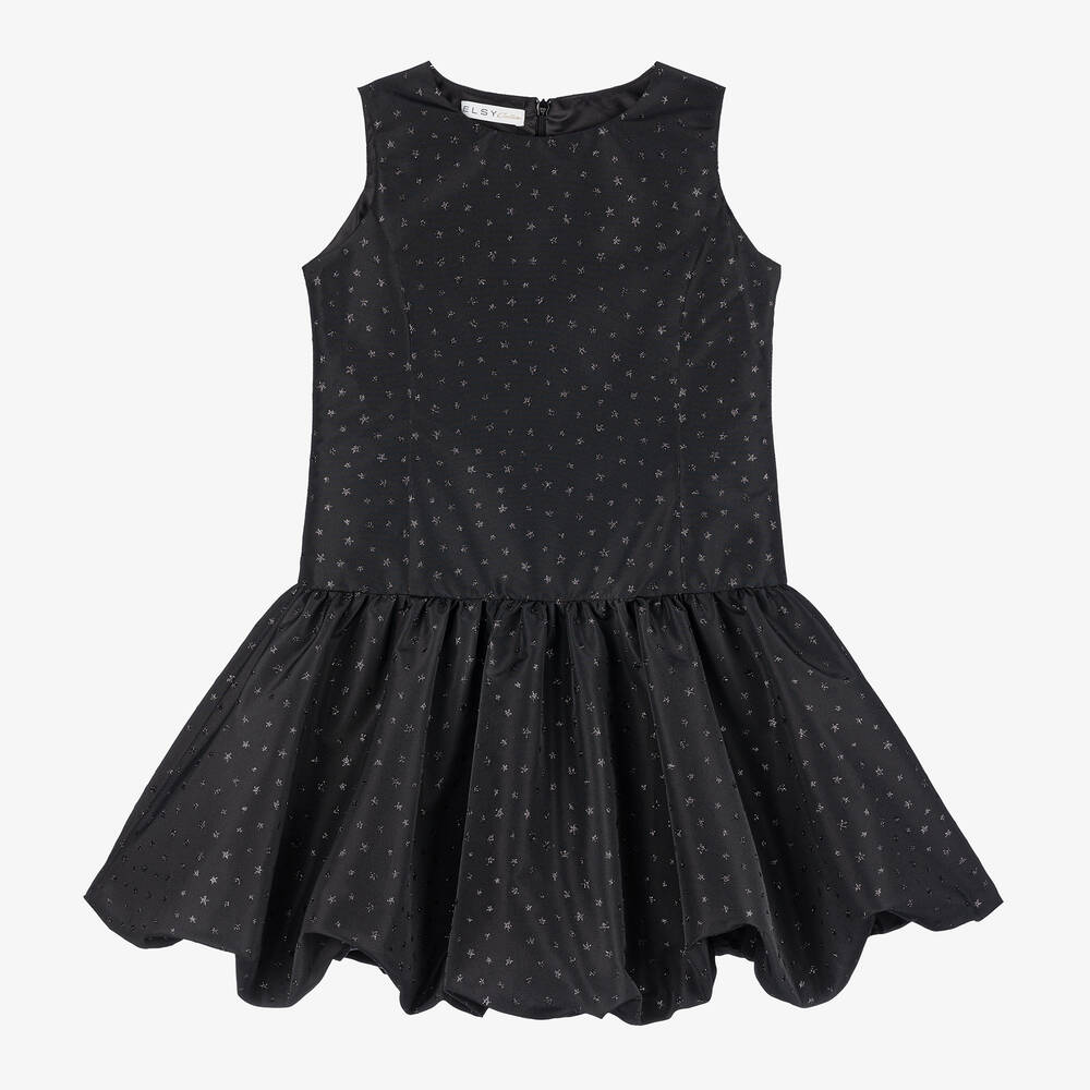 A gorgeous black dress for older girls by Elsy, made in silky smooth and lightweight fabric. Ideal for a party, this sleeveless style is fully lined and scattered with glittery black stars which sparkle from every angle. The fabric gently gathers around the hem for a subtle bubble skirt silhouette. A zip fastens neatly on the back.