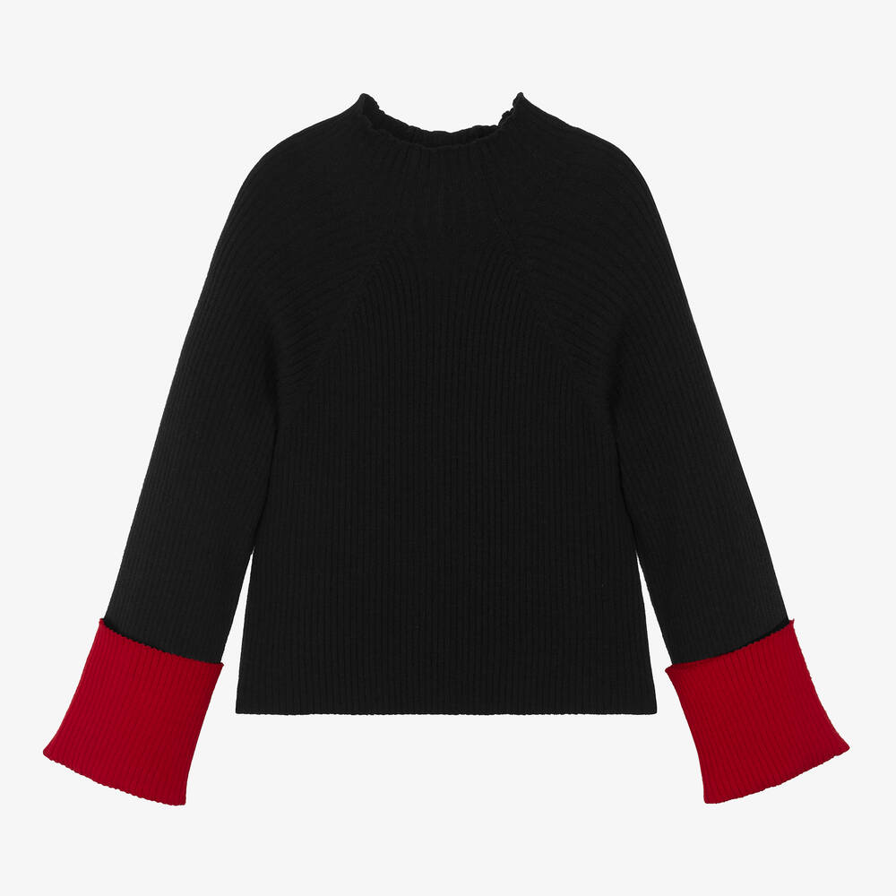 A black ribbed sweater for older girls by Elsy, knitted in a beautifully soft viscose blend. Combining style with comfort, this mid-weight knit has long raglan sleeves with contrasting red cuffs. It is finished with a cosy high neckline.