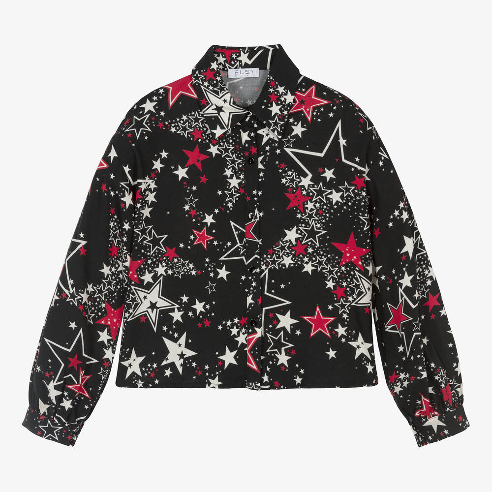 A stylish black blouse for older girls by Elsy, made in soft and lightweight viscose for a lovely drape. This timeless style is patterned with red and ivory stars which stand out against the dark fabric. It has a neat collared neckline and black button fastenings on the front.