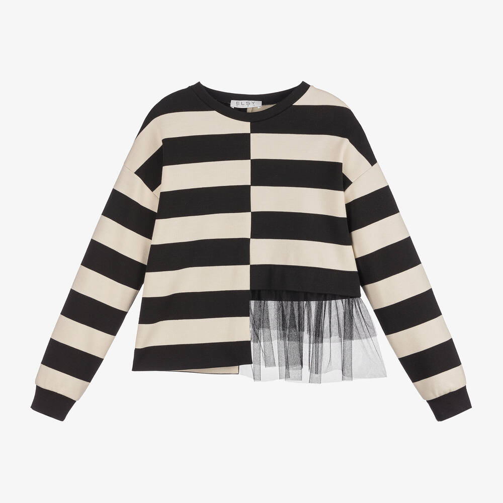 Black and ivory sweater for older girls by Elsy, made in a soft viscose blend. Effortlessly stylish, this jersey top is designed in wide, horizontal stripes with a sheer tulle trim on one side for contrast detailing. It has a comfortable round neckline and long sleeves with lightly ribbed cuffs.