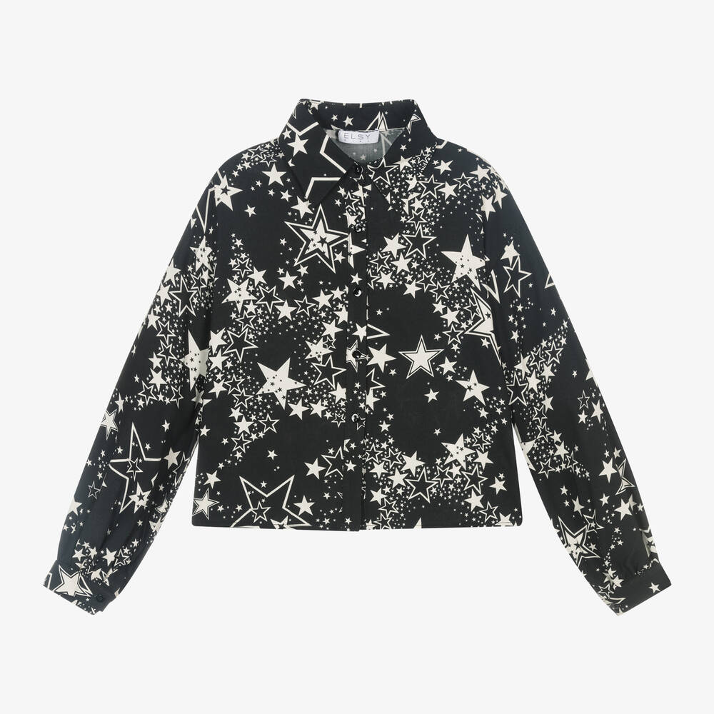 Eye-catching long-sleeved black shirt for girls by Elsy, with an ivory star pattern. Made in beautifully soft, viscose twill, it has a stylish, pointed collar and fastens with buttons on the front and cuffs.