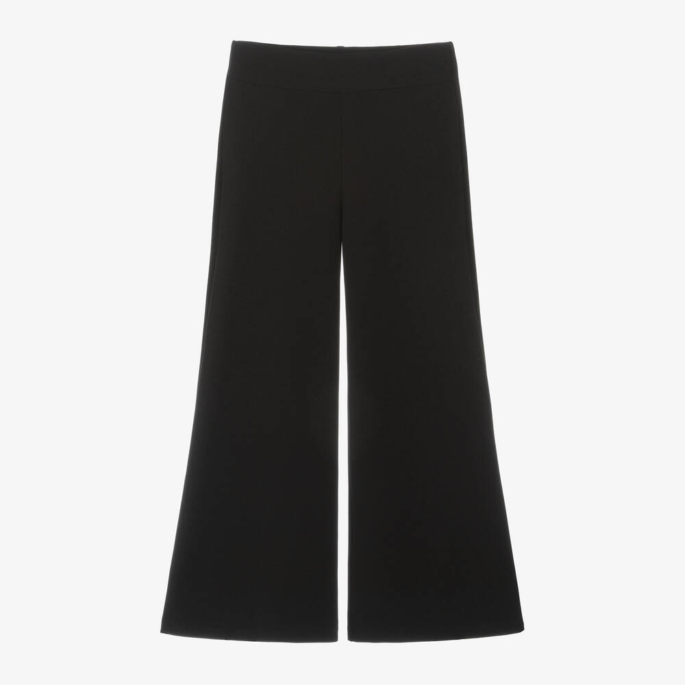 Black trousers for older girls by Italian brand Elsy, made from soft and stretchy crêpe jersey for comfortable wear. Simply styled, these chic trousers have a stylish wide leg silhouette and a gently elasticated waistband for ultimate comfort.