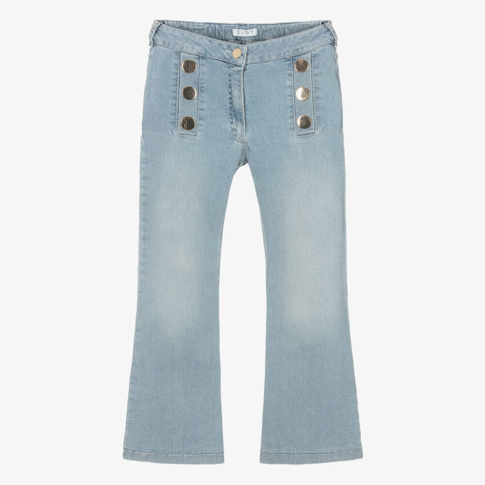 Girls light blue wash jeans by Italian brand Elsy, made in stretchy denim for comfort. In a flared fit, they have a branded silver front button and cool shiny metal hardware on the faux front pockets. They have an adjustable waist for a great fit, and handy patch pockets on the back.