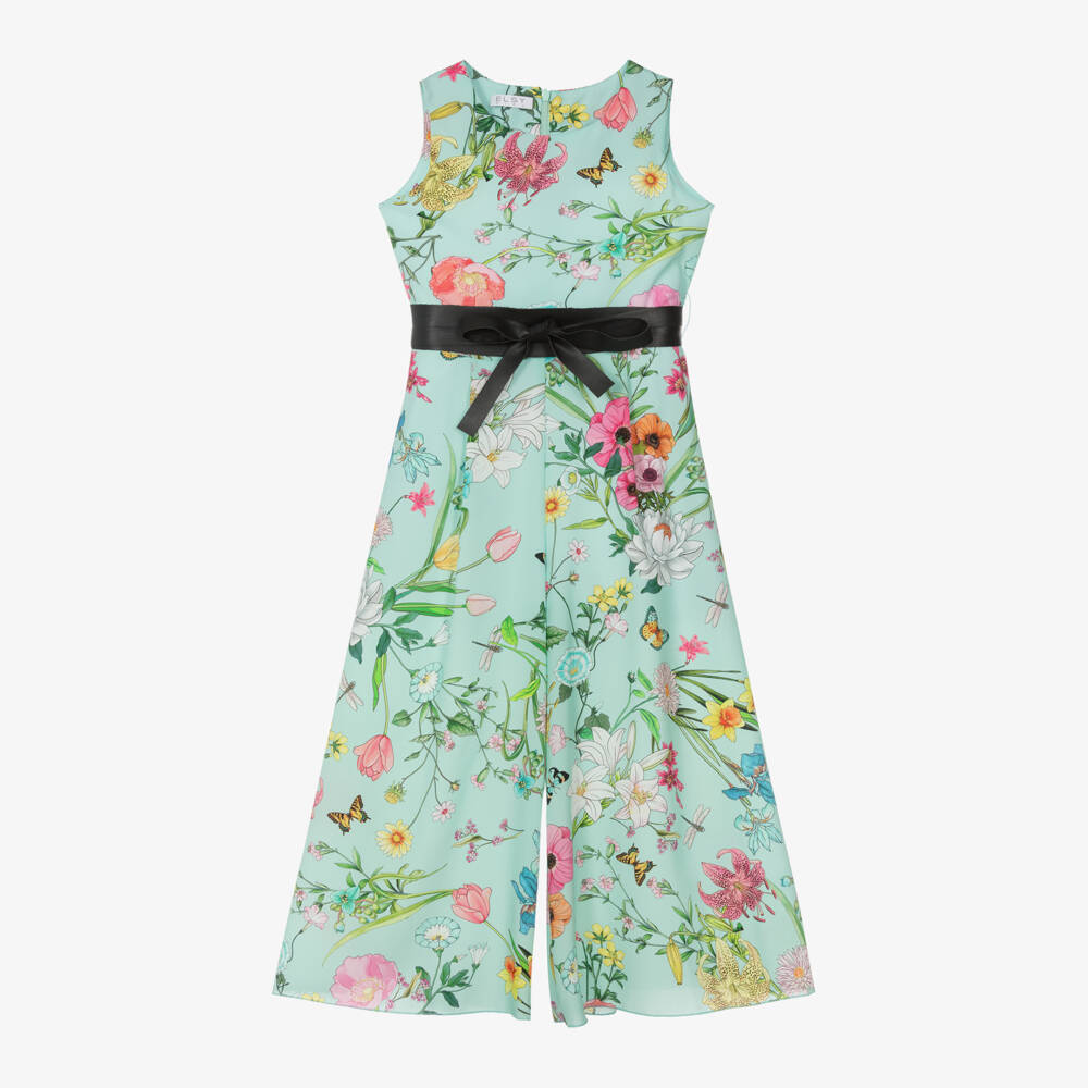 Aqua blue sleeveless jumpsuit for girls by Italian label Elsy, made in crêpe and partially lined with soft cotton. This smart-casual design has a beautiful botanical floral pattern and a chic faux leather tie-up belt in black. In a wide-leg fit, it fastens with a hidden zip on the back for neatness.