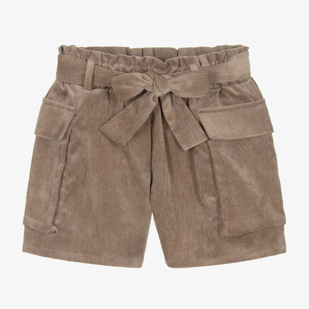 Stylish brown shorts for girls by Italian brand Elsy, made in soft corduroy. They have a comfortable elasticated waist, with a detachable belt that ties into an elegant bow on the front. There are deep flap pockets at the sides to finish.