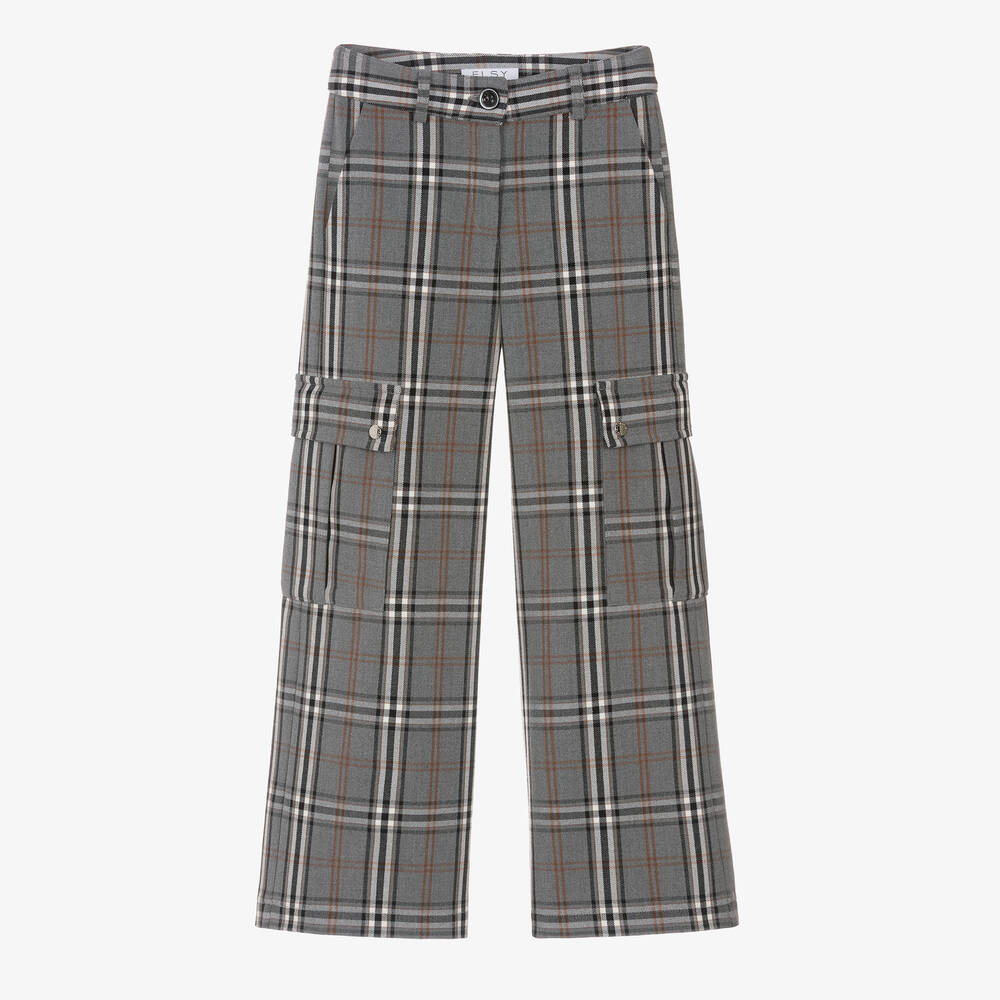 Grey cargo trousers for girls by Elsy, with a chic checked pattern in ivory and brown. These cool trousers have utility pockets on the legs, fastening with branded, silver-tone poppers, and slant pockets on the sides. Fastening with a front button and zip, they are made in a mid-weight viscose mix and designed with an adjustable waist for the best fit.
