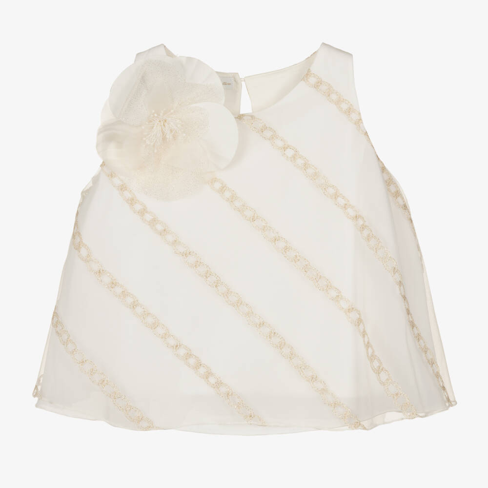 Girls ivory sleeveless blouse by Elsy, woven in lightweight crêpe chiffon with a floaty tulle overlay. Embroidered with sparkly gold chains, it is lined in soft cotton jersey for comfort and fastens with a keyhole button on the back. A decorative tulle flower brooch finishes the glamorous look, adding extra sparkle to this dressy blouse.