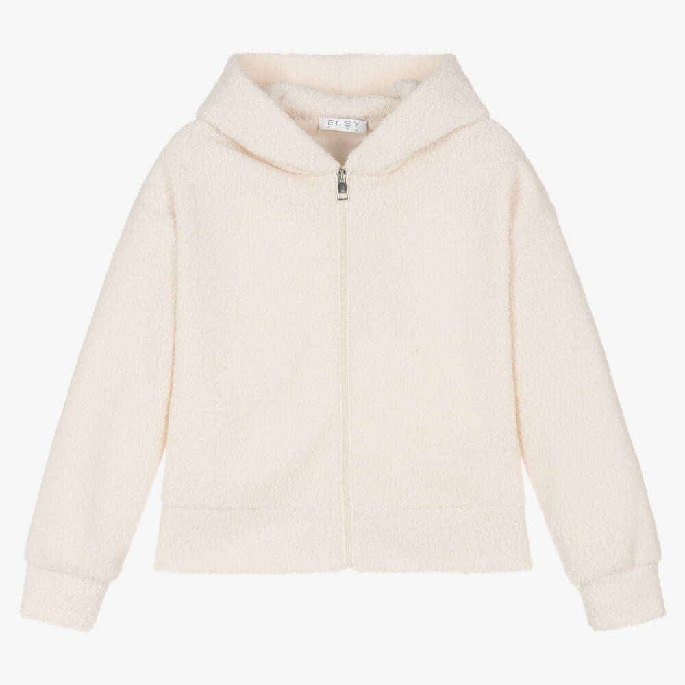 Ivory hooded zip-up top for girls by Elsy, made in soft teddy fleece. Warm and cosy, ideal for layering, it fastens with a zip on the front.