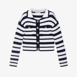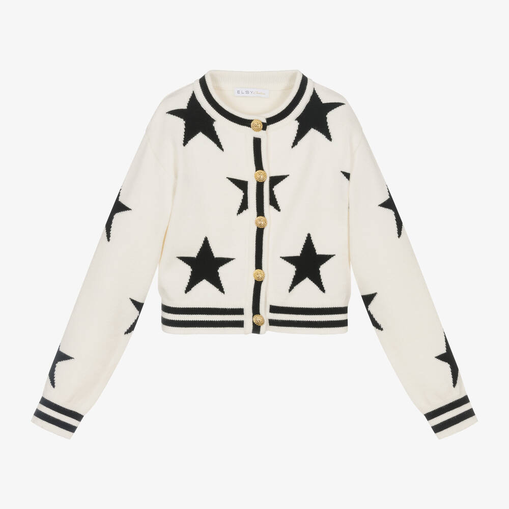 Both smart and super soft, this ivory cardigan for girls by Elsy has a bold, black star pattern. Ideal for layering, it is knitted in a viscose blend, with long sleeves and cosy ribbed trims, striped in black. It fastens with shiny gold, lion-embossed buttons on the front.