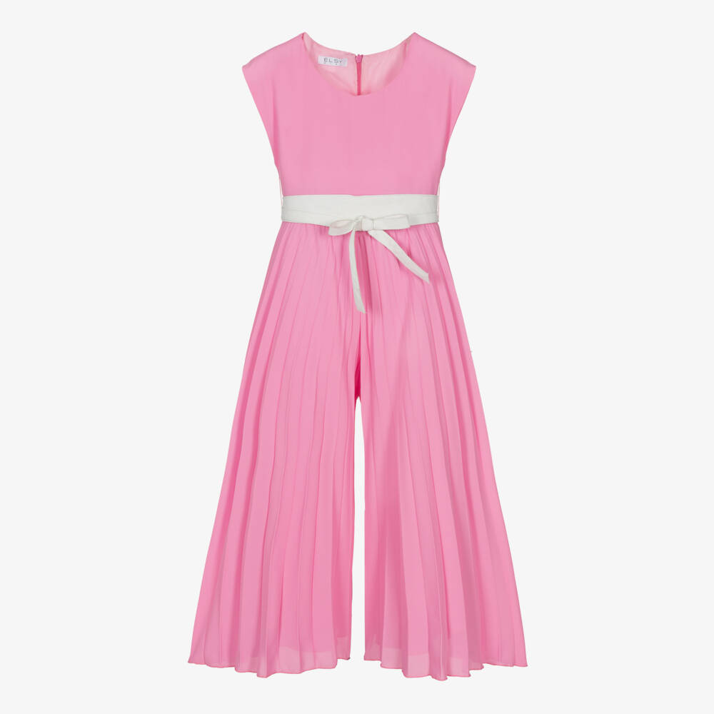 Lovely pink jumpsuit for girls by Elsy, made in soft and lightweight crêpe and fully lined for comfort. This elegant piece has a pleated wide leg fit and a removable, white faux leather tie belt. It fastens neatly on the back with a concealed zip.