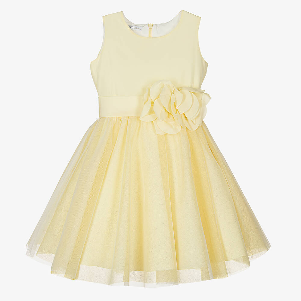 Stunning yellow dress for girls by Elsy, ideal for special occasions. Beautifully made with a sparkly tulle skirt, the silky bodice fastens with a concealed zip on the back for a seamless finish. Lined with layers of tulle for dramatic volume, it has a beautifully decorated sash belt around the waist for an elegant look.