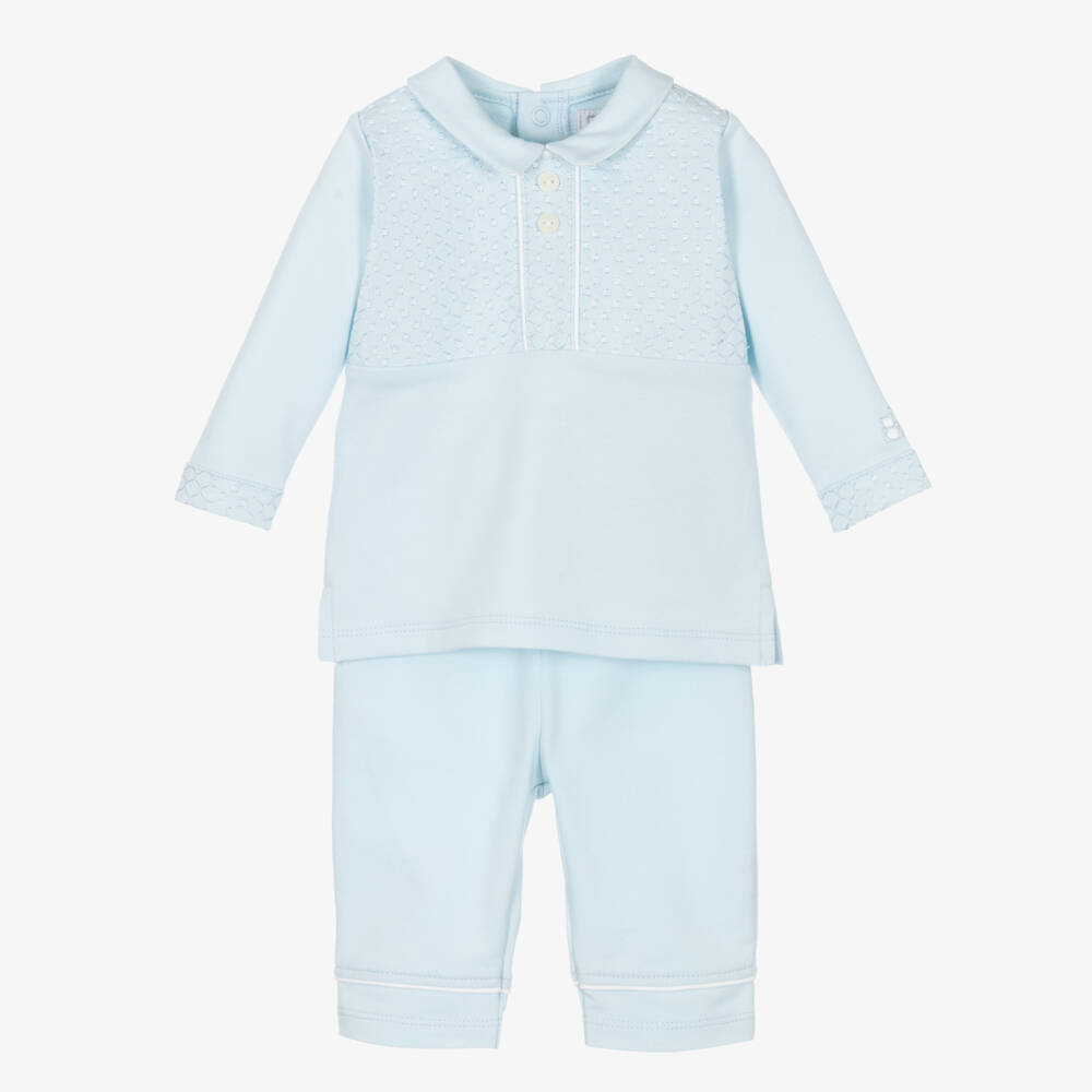 From Emile et Rose, a pale blue trouser set for baby boys. Made in soft cotton jersey for comfort against delicate skin, both pieces have matching white piping detailing and the long-sleeved top has intricate embroidery across the chest for a charming finish.