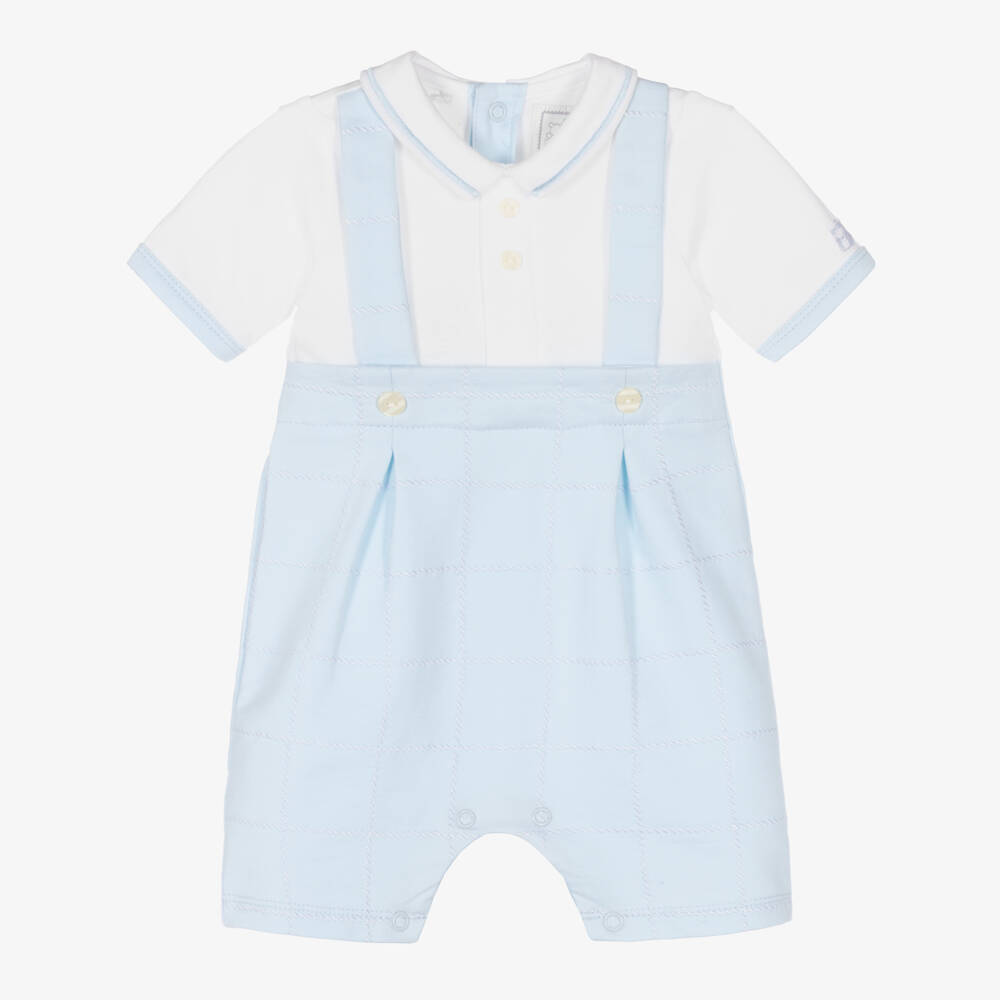 A classical white and blue shortie for baby boys by Emile et Rose, made in the softest cotton jersey. Designed to look like dungarees, this shortie has decorative pearlescent buttons, with a tonal check pattern. It has a pointed collar with blue trims, and an embroidered logo on the sleeve. For easy, effortless dressing, there are useful popper fastenings on the back and between the legs.