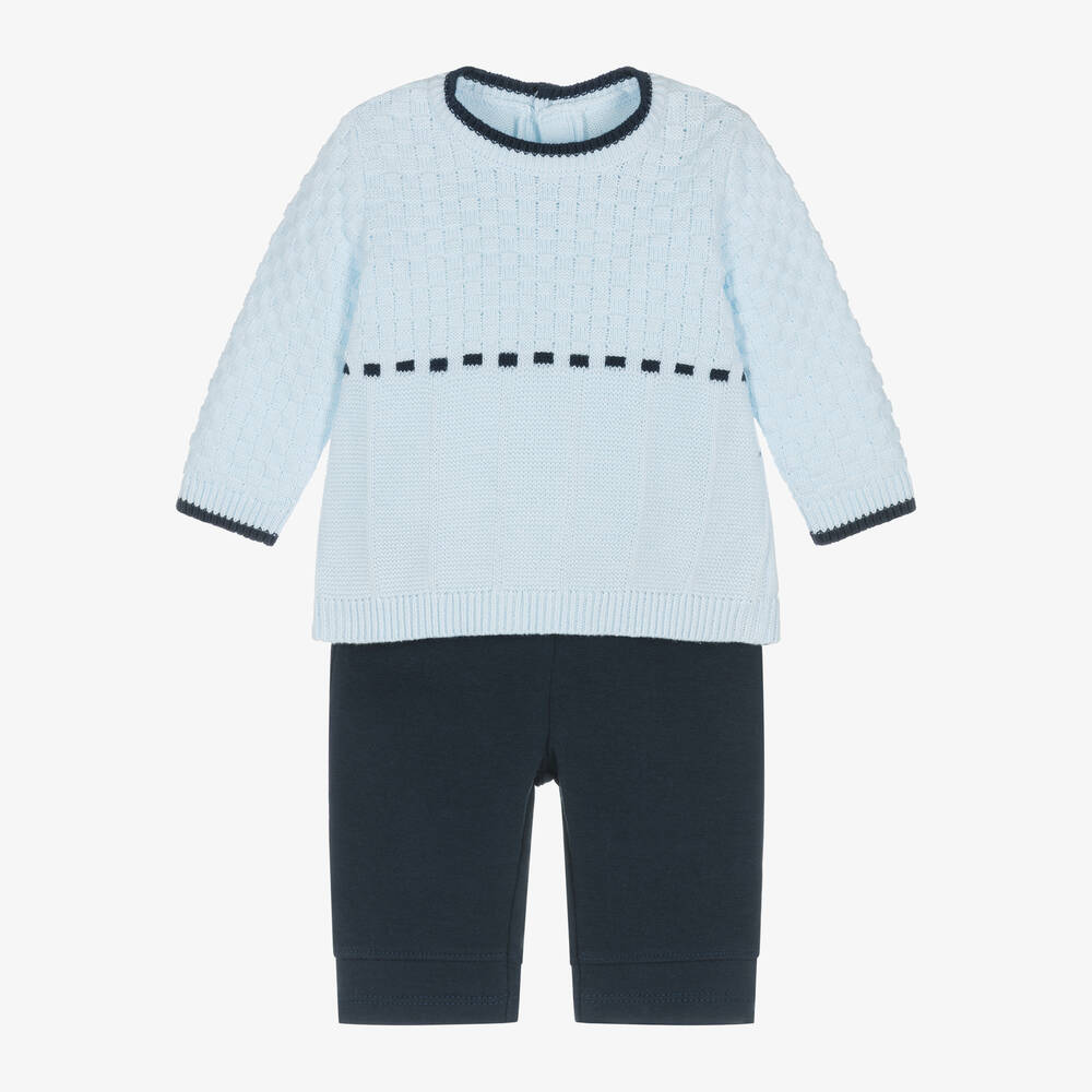 A lovely blue cotton trouser set for baby boys by Emile et Rose. Knitted in soft cotton, the pale blue top features a charming basket weave pattern and navy blue trims. It fastens neatly on the back with pearlescent buttons. In coordinating navy blue, the cotton jersey trousers have a gently elasticated waistband for a comfortable fit on little tummies.
