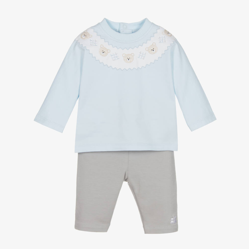 A pale blue top and grey trouser set for baby boys by British brand Emile et Rose. Soft and comfortable, both pieces are made in stretchy cotton jersey. The long-sleeved T-shirt has cute teddy bears embroidered around the ribbed neckline and it fastens easily with poppers on the back. The trousers have a gently elasticated waist for comfort, with the brand's adorable embroidered logo on one leg.