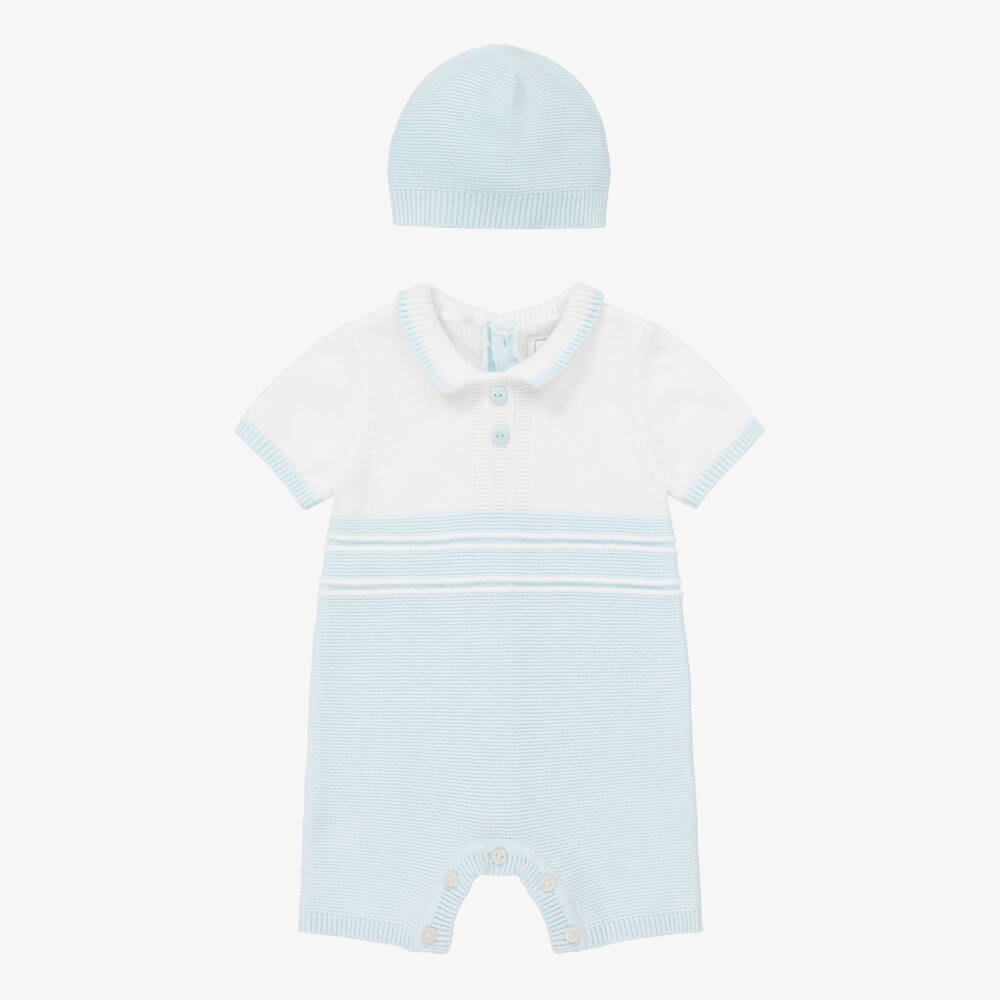 Classically styled, this white and blue shortie set for baby boys is from Emile et Rose. Beautifully soft on delicate skin, both items are knitted from cotton for ultimate comfort. The shortie features a charming intarsia-knit stripe design, with a pointed collar and decorative buttons on the chest. There are button fastenings on the back and between the legs. To finish off this adorable outfit, there is a matching hat.