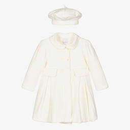Lovely ivory coat and hat set for baby girls by British brand Emile et Rose. Made in soft velour, the coat is lightly padded for extra warmth and has a soft cotton jersey lining. Traditionally styled, with a pleated skirt, it has a rounded collar, faux pockets and button fastenings on the front in a double-breasted style. To complement the coat there is a cute beret with a knotted trim on the top. Both pieces feature the brand's signature embroidered teddy bear and bunny rabbit.