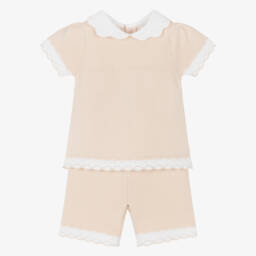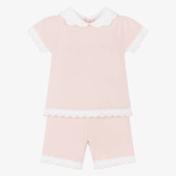 Beautiful pale pink shorts set for baby girls by Emile et Rose, finely knitted in soft cotton. The top features a delicate knit pattern, gently puffed sleeves, and an embroidered white collar. It fastens with pearlescent buttons on the back. The matching shorts have a comfortable elasticated waist, and both pieces have white scalloped edges for a pretty finish.