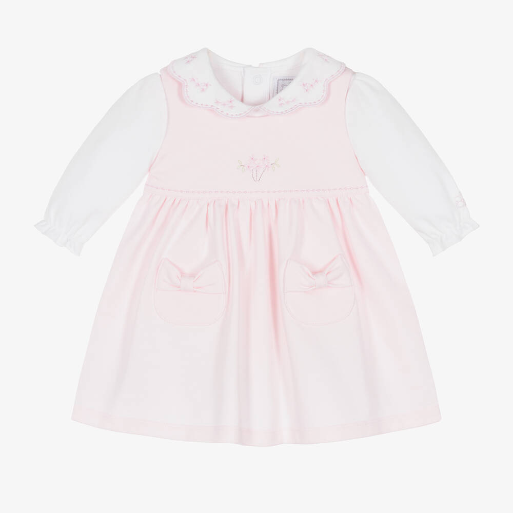 A delightful pale pink and white dress set for baby girls by Emile et Rose, made in a soft cotton jersey. The sleeveless style dress has pretty floral embroidery on the chest and little patch pockets on the skirt, trimmed with bows. On little sizes, the long-sleeved bodysuit has a sweet collar with pink floral embroidery and a scalloped edge. Bigger sizes include the same sweet embroidered details on a long-sleeved top. Both pieces fasten easily with poppers.