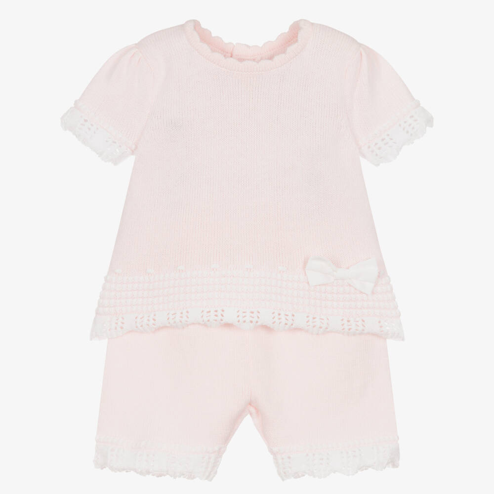 Lovely pink shorts set for baby girls by Emile et Rose, knitted from soft cotton. Fastening with back buttons, the top has wonderful white crochet trims and a bow above the hem. Matching trims can be found on the accompanying shorts, for a co-ordinated outfit.