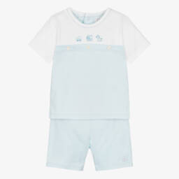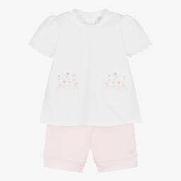 Light pink shorts set for baby girls by Emile et Rose, made in soft cotton jersey. The top has pretty stitching around the collar and embroidered pink rose buds on the sleeves. Pintucks and a small satin bow on the front add extra detailing. The matching shorts have an elasticated waistband for added comfort.