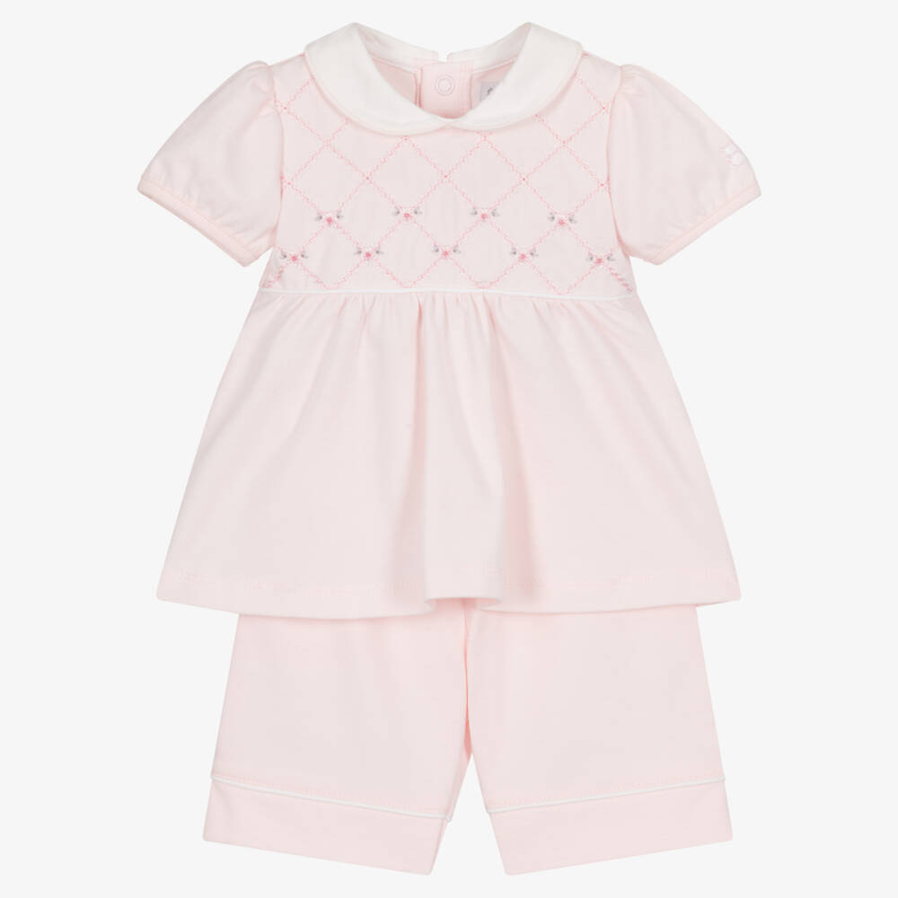 Lovely pink shorts set for baby girls by Emile et Rose, made in soft cotton jersey. Fastening with back poppers, the pink tunic top has wonderful pink diamond embroidery with delicate pink flowers. It comes with pale pink bloomer style shorts.