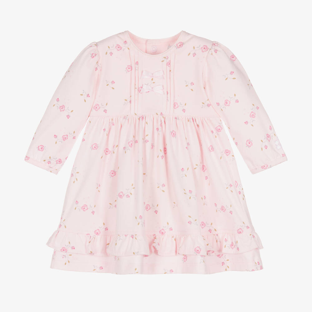 A lovely pink dress for baby girls by Emile et Rose, made in soft cotton jersey. With a beautiful floral pattern, this traditionally styled dress has pin tucks and satin bows decorating the bodice. It has long puff sleeves, a gently gathered waistline and a pretty ruffle hem. There are popper fastenings on the back for easy dressing.