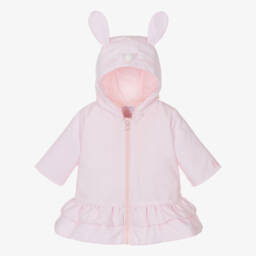 Light pink coat for baby girls by Emile et Rose, made in beautifully soft fabric with a comfortable jersey lining. It has elasticated cuffs for comfort and a fully detachable hood that secures easily to the neckline with poppers. Two decorative front pockets are trimmed with satin bows for a pretty finish.