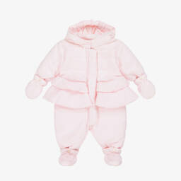 Pale pink snowsuit for baby girls by Emile et Rose, with warm mid-weight padding and a soft jersey lining. Fastening with a popper beneath the chin, this cosy one-piece has an elasticated trim on the fixed hood for a secure fit. It fastens easily with a zip and for an extra snug feel comes with detachable mittens and booties, secured with buttons. The ruched front is trimmed with decorative bows and the brand's teddy and bunny logo is embroidered on both booties for a cute finish.