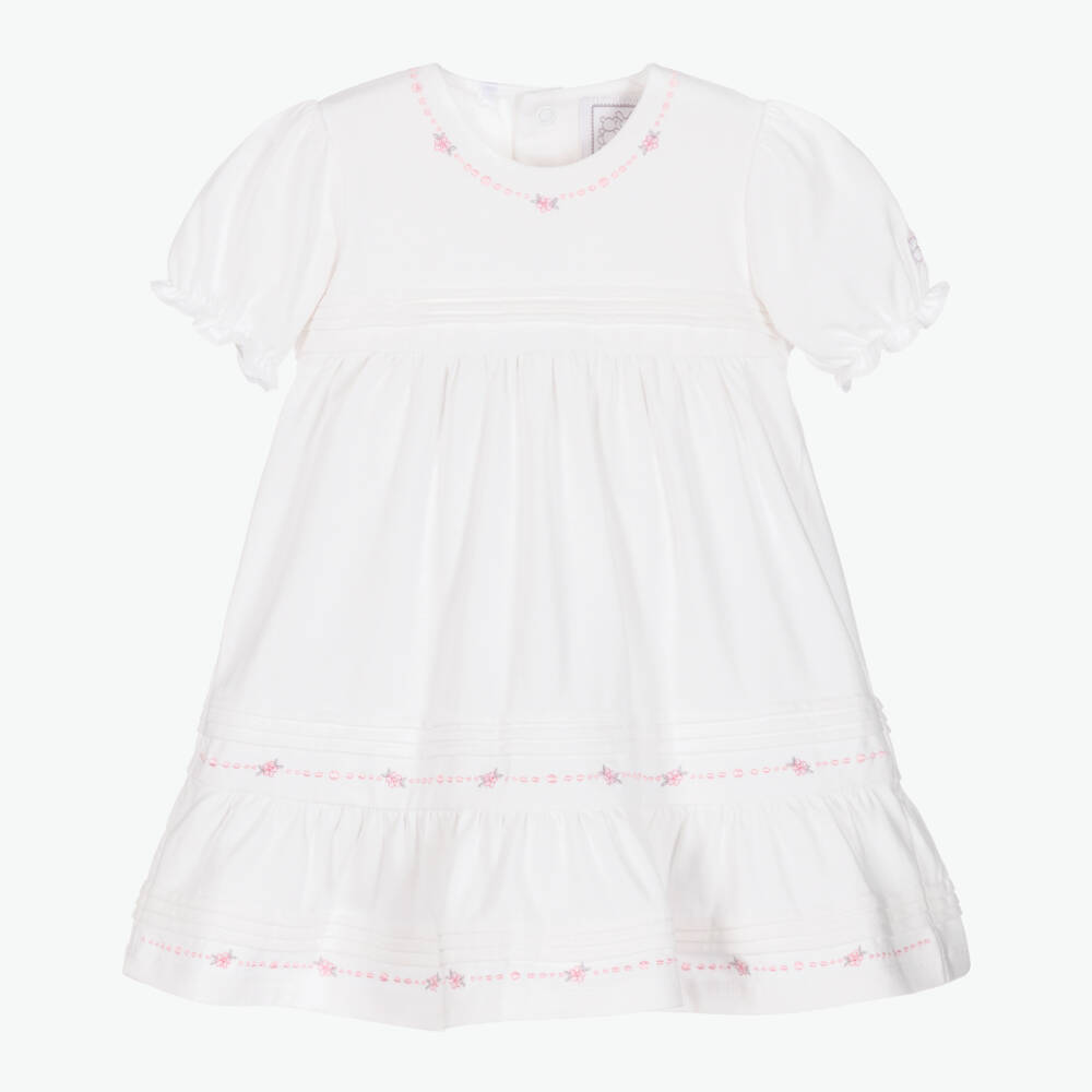 A beautiful white dress for baby girls by Emile et Rose, made in the softest cotton jersey. In a timeless style, this dress has charming pin tucks, elasticated puff sleeves, and pink embroidered rose trims. There are useful popper fastenings on the back, and matching knickers for modesty.