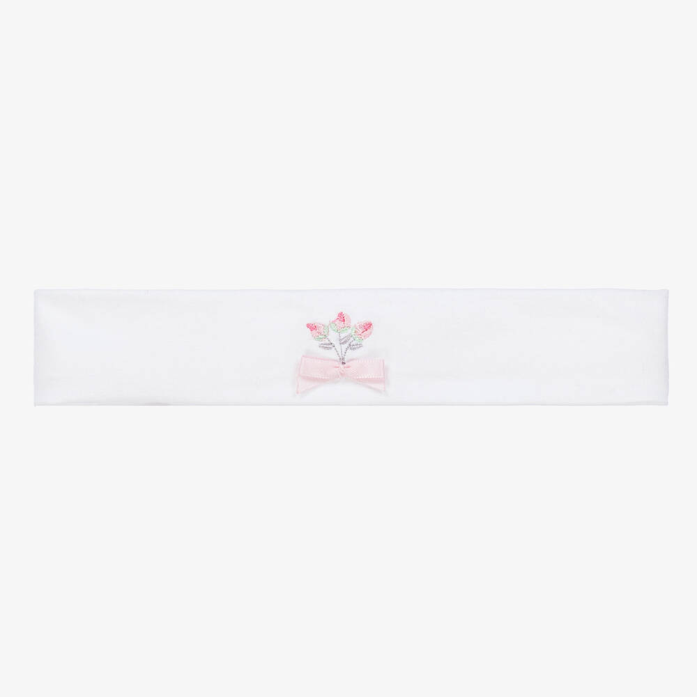 An adorable white headband for baby girls, by Emile et Rose. Made in the softest cotton jersey, this accessory is delicate on little heads, with a comfortably elasticated back. It has a beautiful floral embroidery, with a tiny satin bow above.