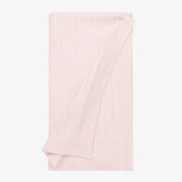 A sweet pale blue blanket for baby boys and girls by Emile et Rose. Beautifully knitted in super soft cotton, it has a striped and cable knit design with a ribbed border. Lovely and lightweight, it can also be used in the stroller or as a nursery accessory.