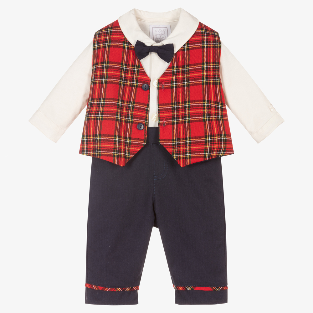 A lovely three piece cotton trouser set for baby boys by Emile et Rose, in blue, red, and ivory. The ivory jersey shirt has logo embroidery on one sleeve and comes with a navy blue bow tie that attaches with poppers under the collar. The set is completed with a red tartan waistcoat and navy blue herringbone trousers with tartan trims.